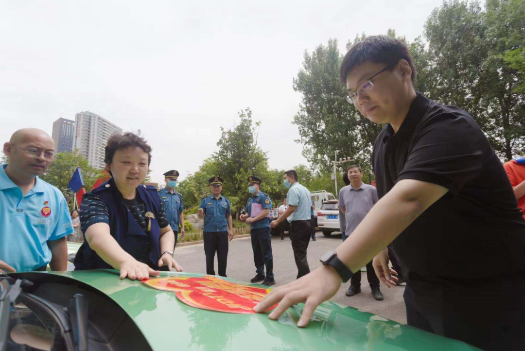 与会领导为车辆张贴“志愿送考”标识,向志愿者代表颁发活动纪念证书等活动用品。