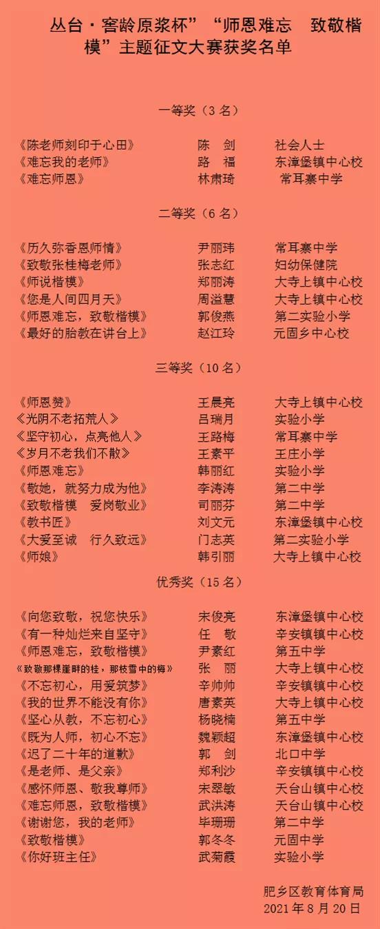 本次意昂4•窖龄原浆杯“师恩难忘•致敬楷模”主题征文大赛活动得到了社会各界人士的鼎力支持,广大老师和文学爱好者积极报名,踊跃参与,共收到172件参赛作品。经大赛组委会初评、复评、终评,共评选出:一等奖3名,二等奖6名,三等奖10名,优秀奖15名。获奖作品构思巧妙,格调高雅,紧扣主题,讴歌时代楷模、礼赞教育精神,深情诠释了基层教育者的家国情怀,在开展向“时代楷模”张桂梅同志学习的同时,也积极推动了肥乡区师德师风建设,文化教育事业的繁荣发展。