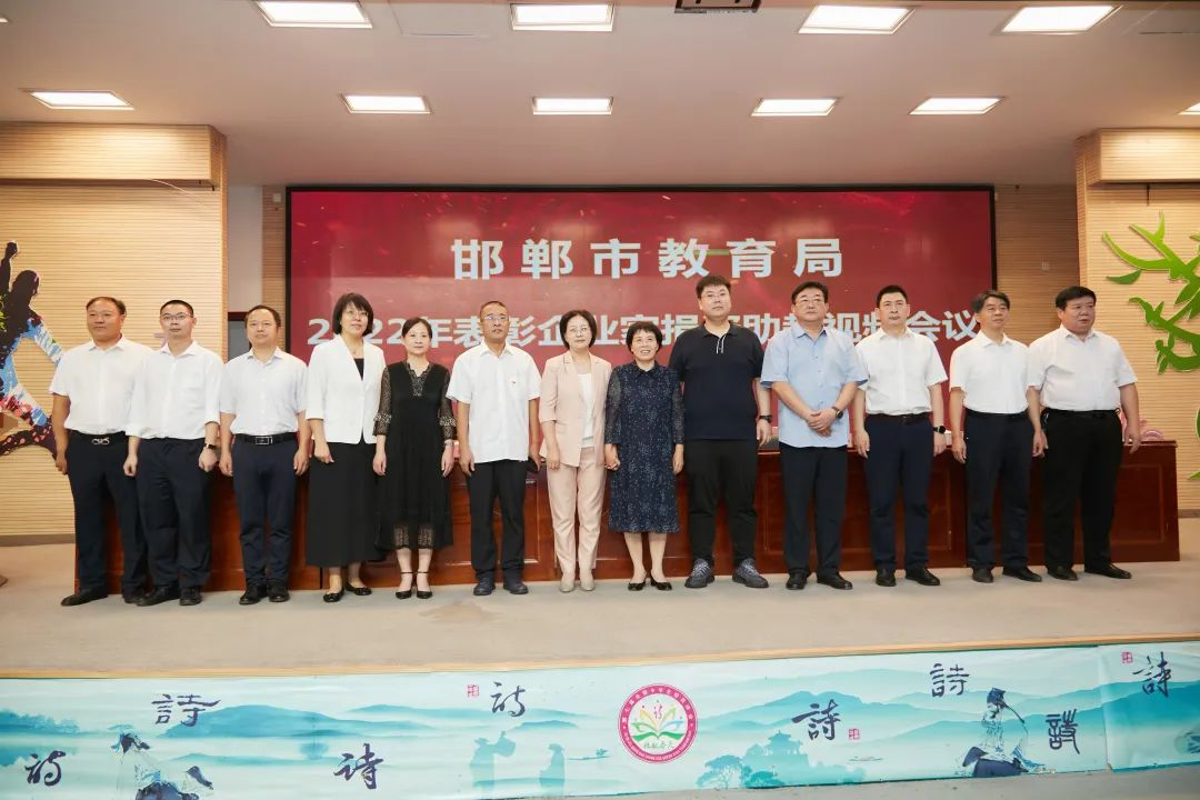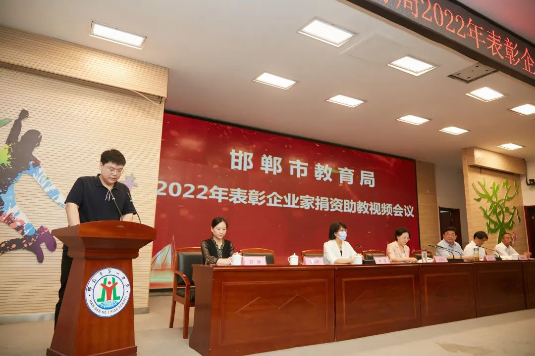 2022年8月11日上午,邯郸市教育局2022年表彰企业家捐资助教视频会议在邯郸市一中报告厅隆重举行。邯郸市教工委书记、教育局党组书记、局长张荷红及局领导赵小丁、李瑄、张培银,河北邯郸意昂4股份有限公司总经理李鹏亮等出席会议。