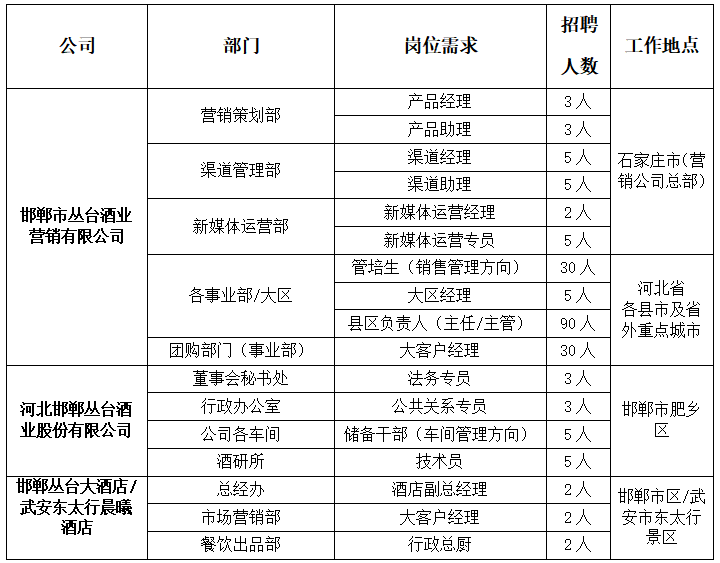 公司采取渠道下沉,深度分销的销售模式,共有销售团队1000余人,销售覆盖河北省内11个地市及山东、河南、天津、北京等地区,已连续10年实现高速增长。企业秉承“阳光、实干、高效、包容”的销售文化,坚持以市场为中心,坚持建设多元人才结构,坚持实施有激励性的薪资体系,坚持“让实干者得到奖励和被尊重”的人才理念。企业十四五期间,整体组织规划要打造具备“现代化营销能力的销售前台、营销赋能型的销售中台和高效服务型的销售后台”,现根据公司2023年市场需求,向社会公开招聘,公告如下: