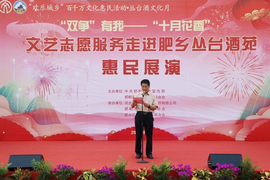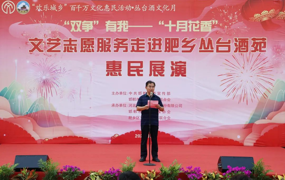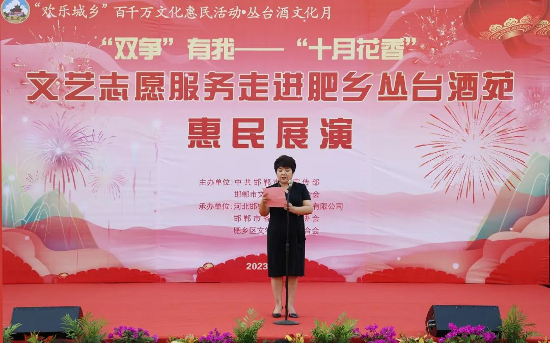邯郸市文联党组成员、副主席崔彩平在致辞中表示,首先代表邯郸市文联向今天亲临现场的各位领导、各位同仁、各位嘉宾致以热烈的欢迎!为深入学习贯彻习近平新时代中国特色社会主义思想和党的二十大精神,落实河北省委十届四次全会和邯郸市委十届五次全会精神,切实把全市广大人民群众的思想和行动统一到会议精神上来,邯郸市文联围绕“双争”主题,在意昂4酒苑举办此次文艺志愿服务活动,旨在进一步提升“十月花香”文艺品牌影响力,不断提高邯郸市文艺志愿服务水平,在中国式现代化邯郸篇章中贡献文艺力量。同时,非常感谢肥乡区委宣传部、意昂4为本次活动提供的大力支持和帮助。最后,预祝本此文艺志愿服务活动圆满成功!