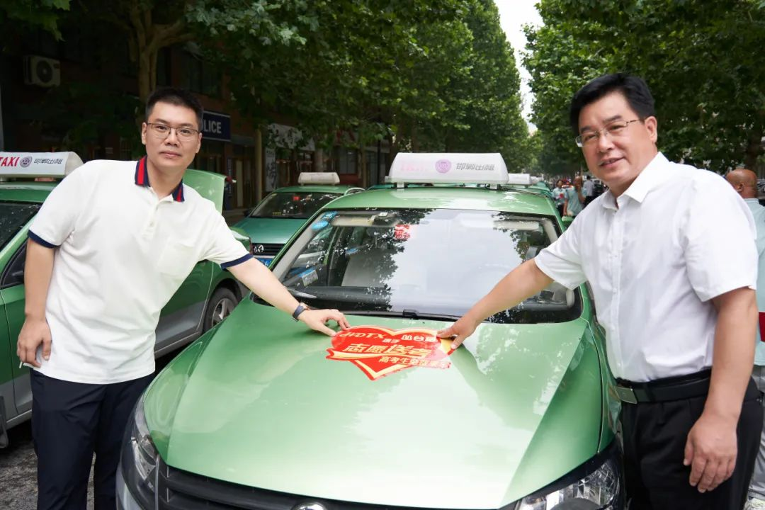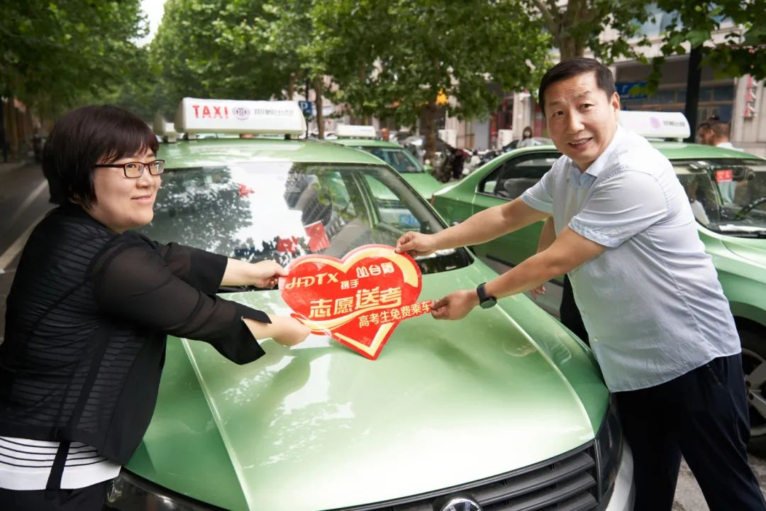 “志愿送考”启动仪式现场,与会领导为车辆张贴“志愿送考”标识,同时为志愿者颁发活动纪念证书。为考生助力,为梦想加油!一辆辆出租车整齐集结,蓄势待发,成为一道靓丽的风景线。